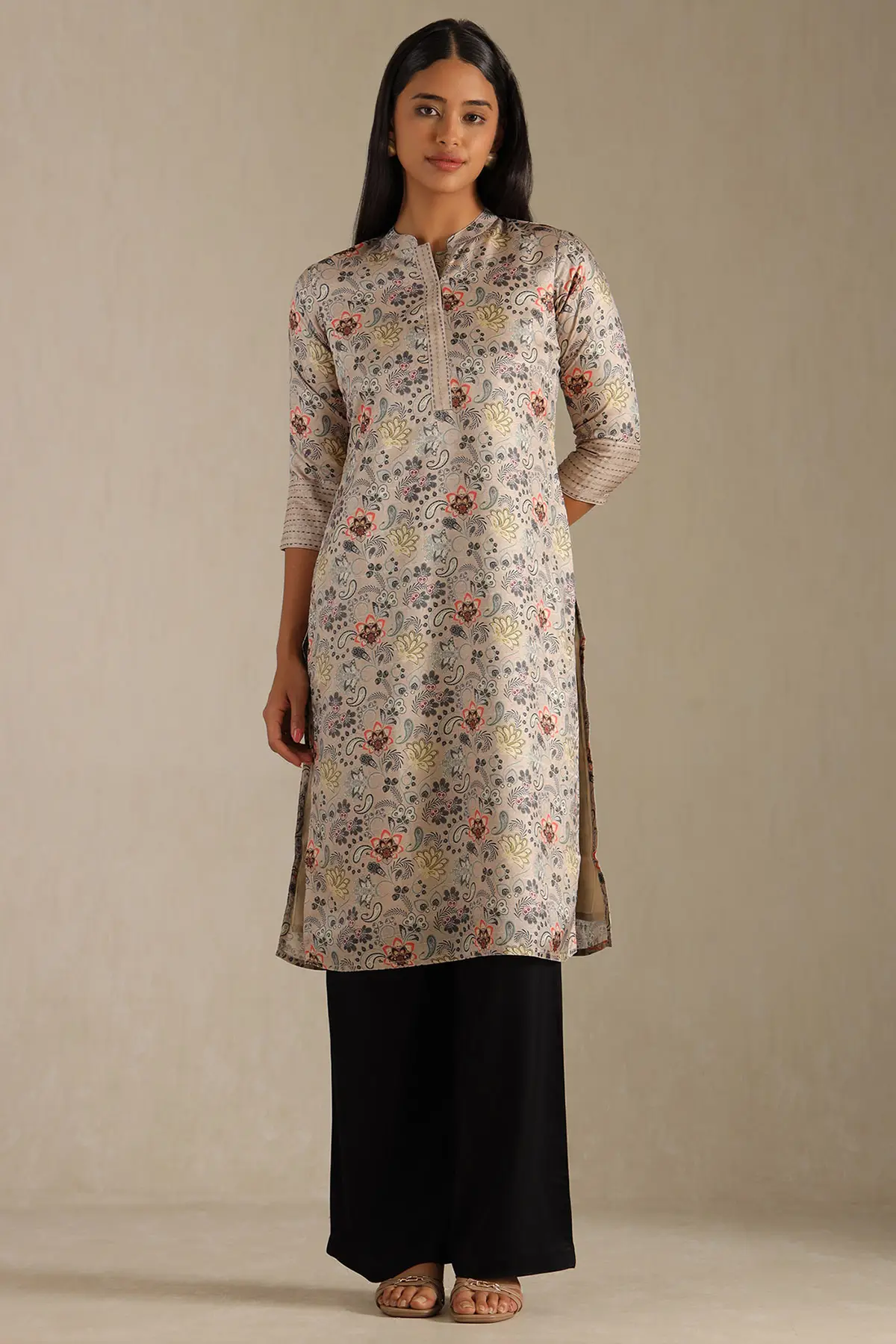 If your mood board features indie vibe, fresh and feminine energy, and soft core aesthetics, then our beige silk-blend floral-printed kurta for women is perfect for you. This kurta design screams, “I woke up and chose elegance.” This kurta is all about the main character’s energy, with its soft, silky fabric that falls dramatically and flows with every move. Pair it with jhumkas, tailored trousers, and your confidence, and be ready to slay in any casual gatherings or a random Tuesday morning.