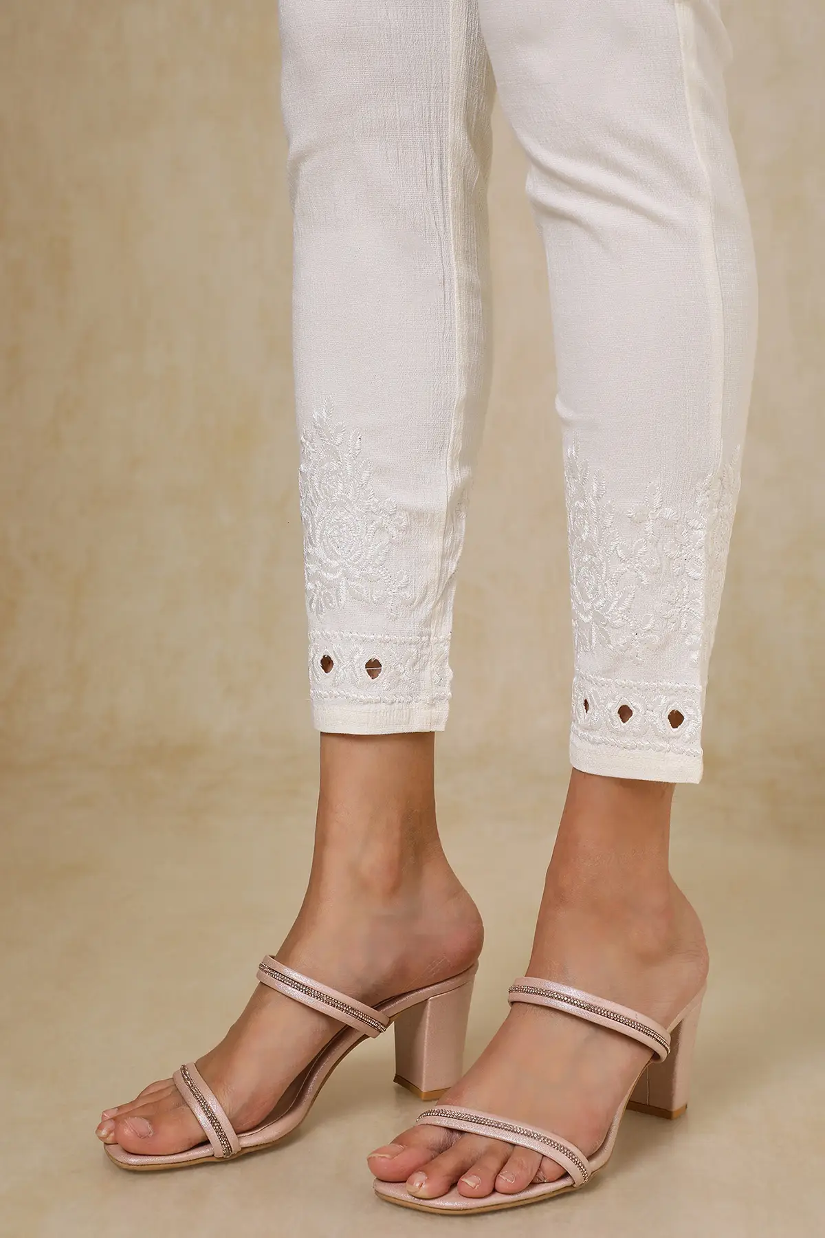 Off-white viscose blend trousers with exquisite thread embroidery, adding rich texture and elegance, will update your ethnic outfit. Appropriate for professional and informal events, the viscose mix fabric guarantees a good fit and maintains a sophisticated look. The trousers are flexible enough to match different shirts or kurtas, and the delicate thread embroidery adds subdued elegance. Perfect for individuals looking to combine history with modern design, these trousers provide a sophisticated, elegant appearance for festive occasions or casual